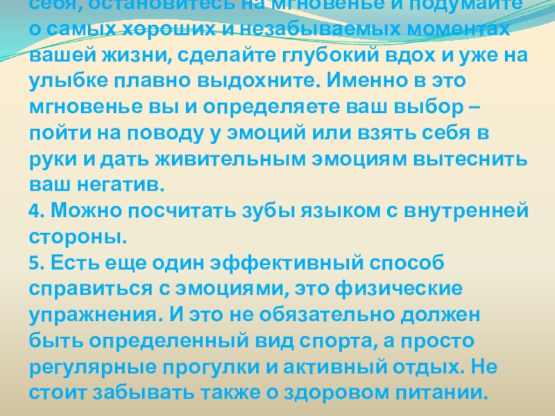 мгновенье и подумайте о самых хороших и незабываемых моментах вашей жизни, сделайте глубокий вдох и уже на улыбке плавно выдохните. Именно в это мгновенье вы и определяете ваш выбор – пойти на поводу у эмоций или взять себя в руки и дать живительным эмоциям вытеснить ваш негатив.