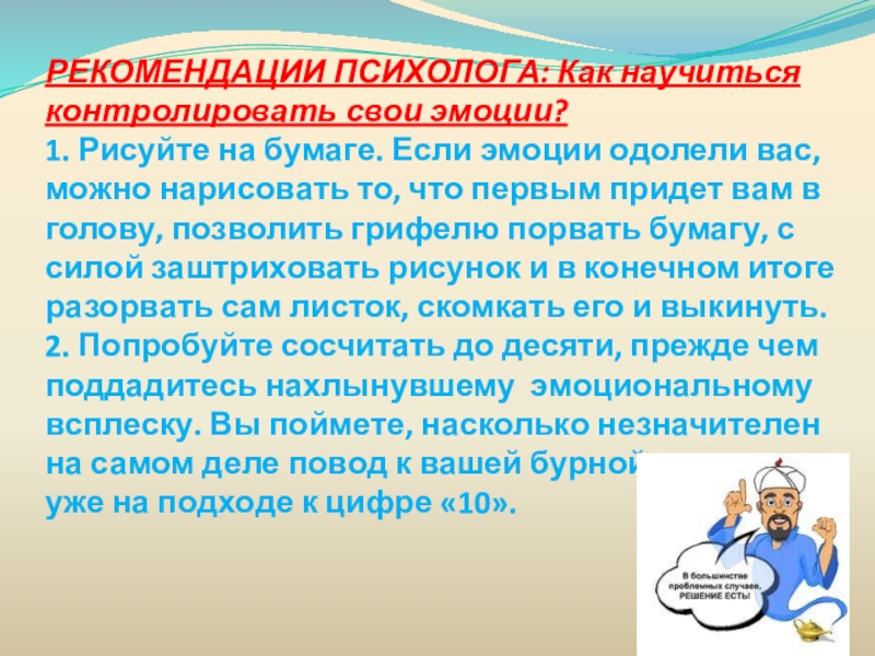 Слайд 7РЕКОМЕНДАЦИИ ПСИХОЛОГА: Как научиться контролировать свои эмоции?
