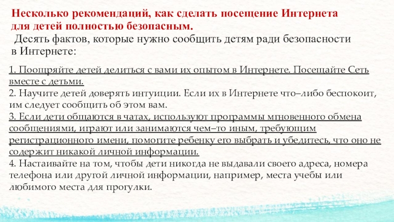 Слайд 14Несколько рекомендаций, как сделать посещение Интернета для детей полностью безопасным.