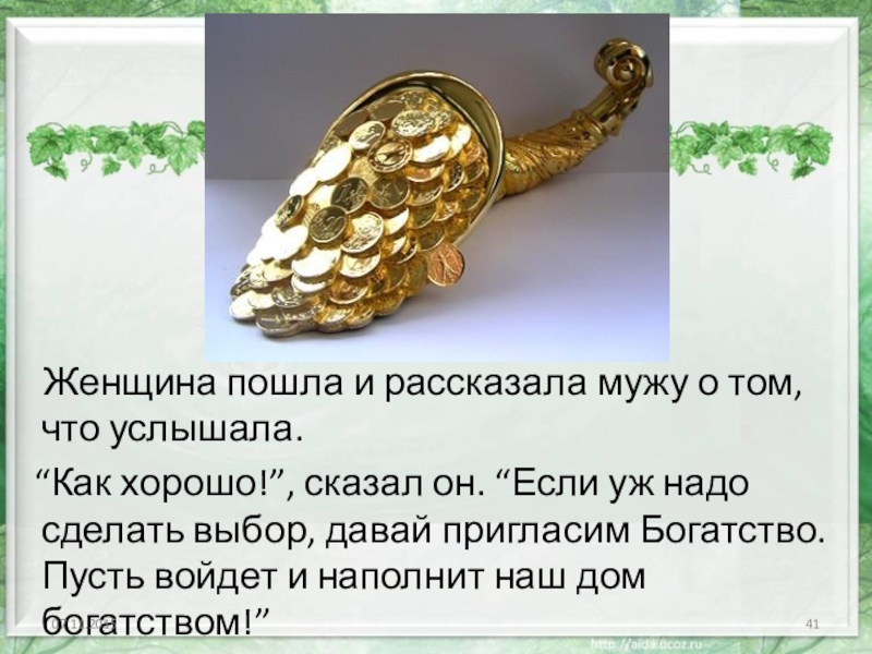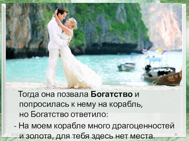 Слайд 80 Тогда она позвала Богатство и попросилась к нему на корабль, но Богатство