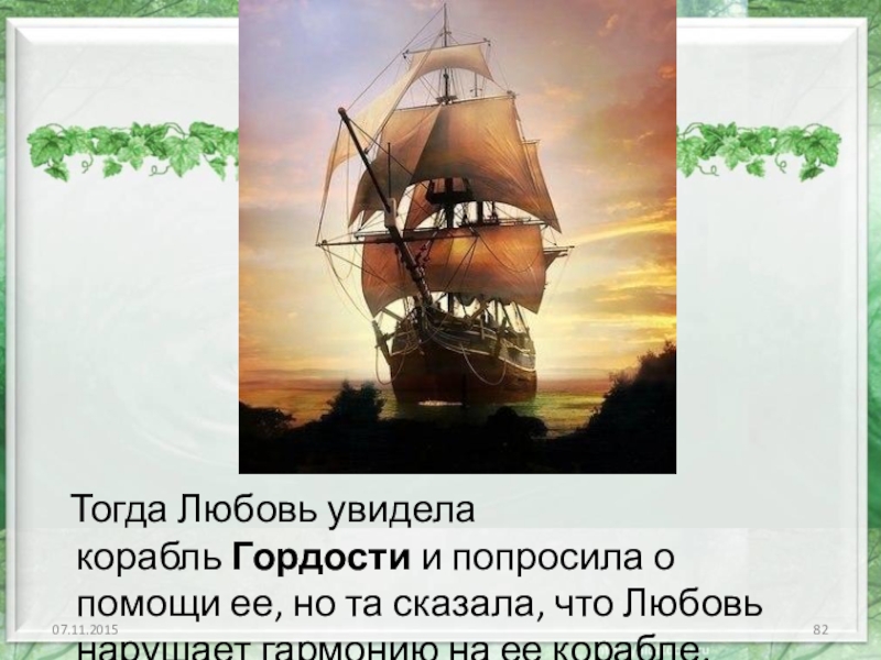 Слайд 82 Тогда Любовь увидела корабль Гордости и попросила о помощи ее, но