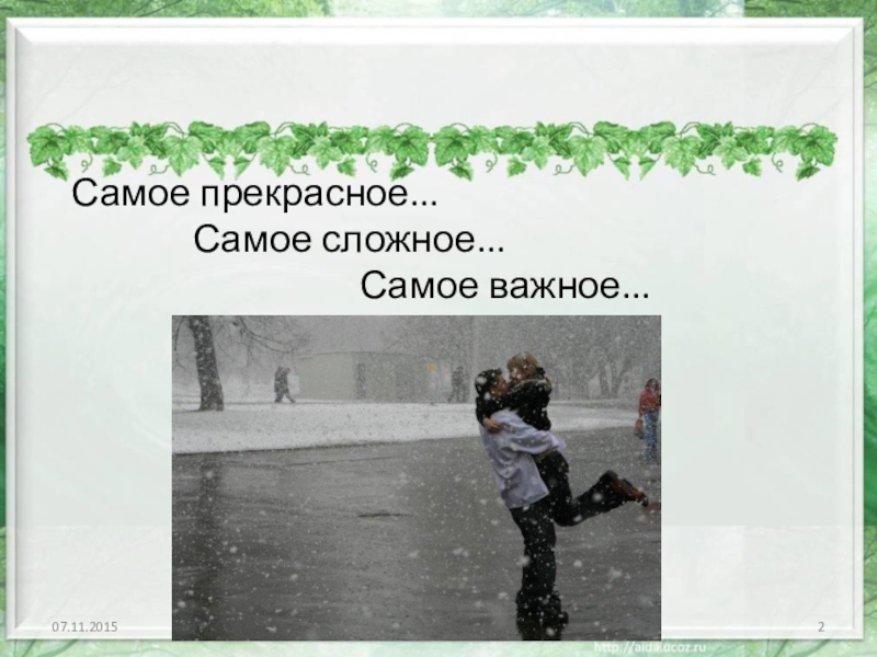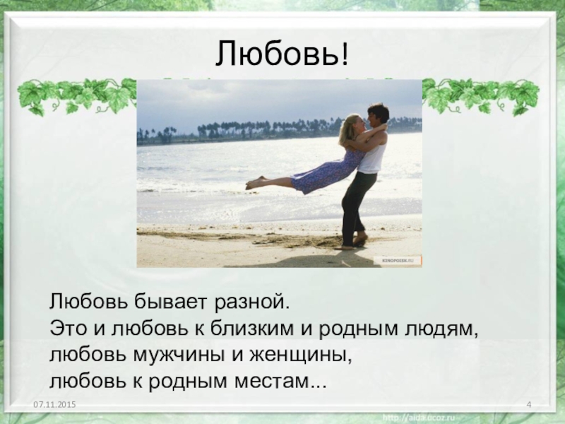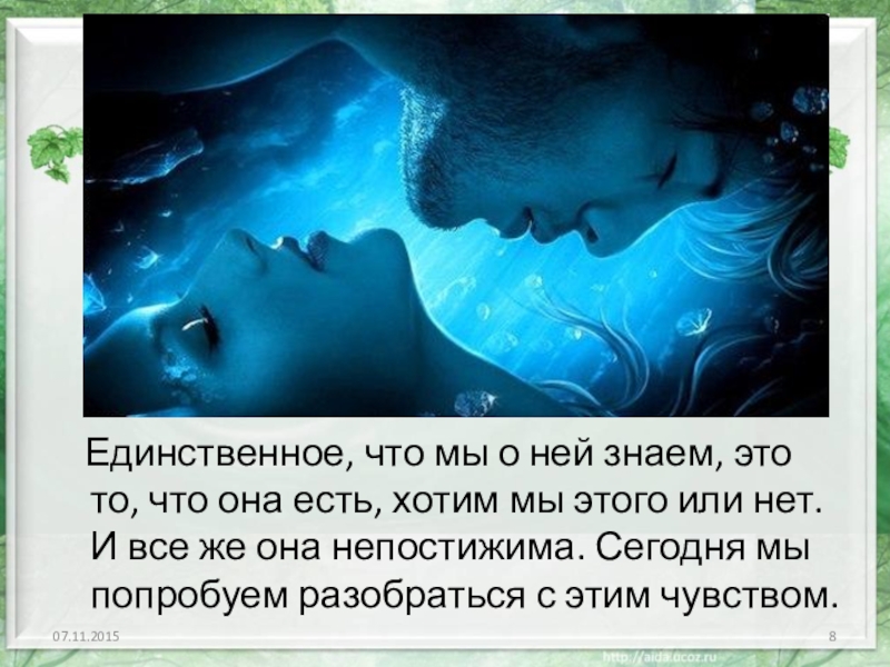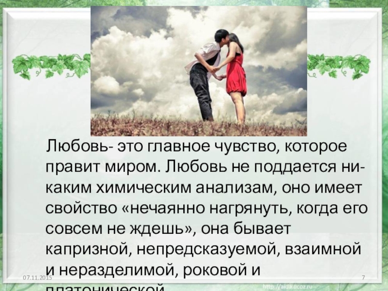 Слайд 7 Любовь- это главное чувство, которое правит миром. Любовь не поддается ни-