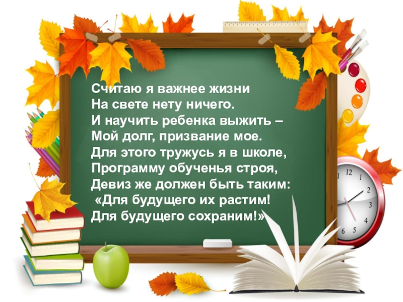 Считаю я важнее жизниНа свете нету ничего.И научить ребенка выжить –Мой долг, призвание мое.Для этого тружусь я