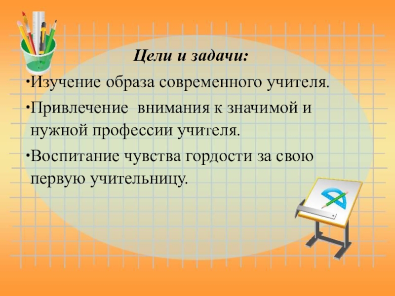 Цели и задачи:Изучение образа современного учителя.Привлечение  внимания к значимой и нужной профессии учителя.Воспитание чувства гордости за свою