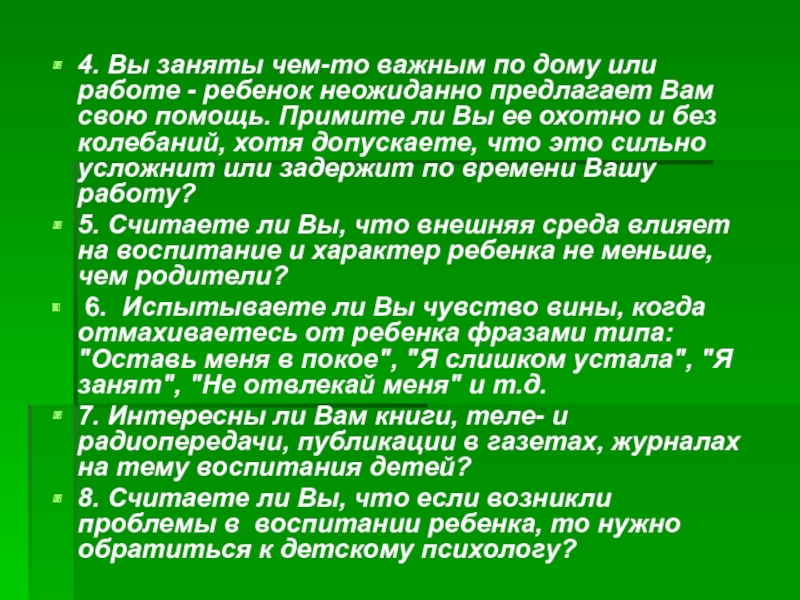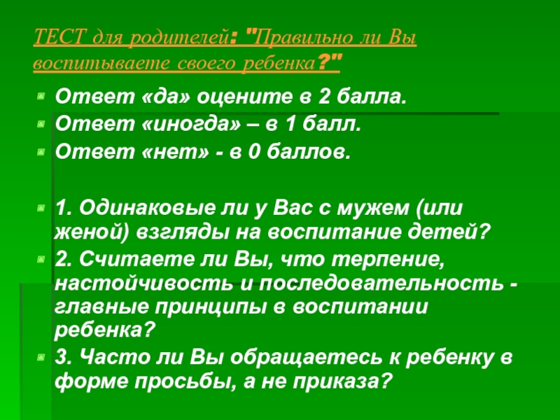 Слайд 3ТЕСТ для родителей: "Правильно ли Вы воспитываете своего ребенка?"