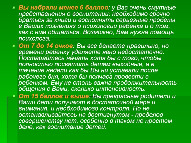 От 15 баллов и выше: Вы прекрасные родители и Ваши дети получают в достаточной мере и внимания, и необходимого контроля. Но не останавливайтесь на достигнутом - пределов совершенству нет, особенно в таком не простом деле, как воспитание детей.