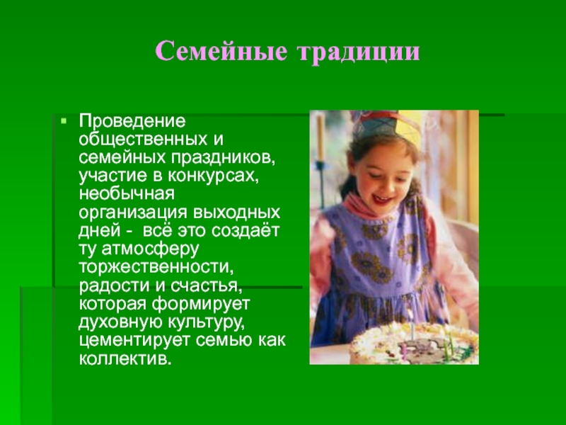 организация выходных дней - всё это создаёт ту атмосферу торжественности, радости и счастья, которая формирует духовную культуру, цементирует семью как коллектив.