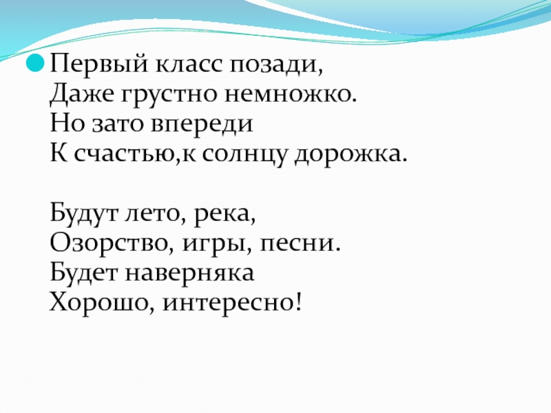 Первый класс позади, Даже грустно немножко. Но зато впереди К счастью,к солнцу дорожка.  Будут лето, река,