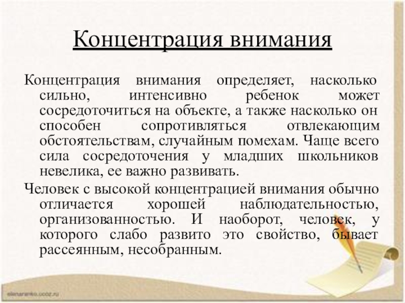 объекте, а также насколько он способен сопротивляться отвлекающим обстоятельствам, случайным помехам. Чаще всего сила сосредоточения у младших школьников невелика, ее важно развивать.