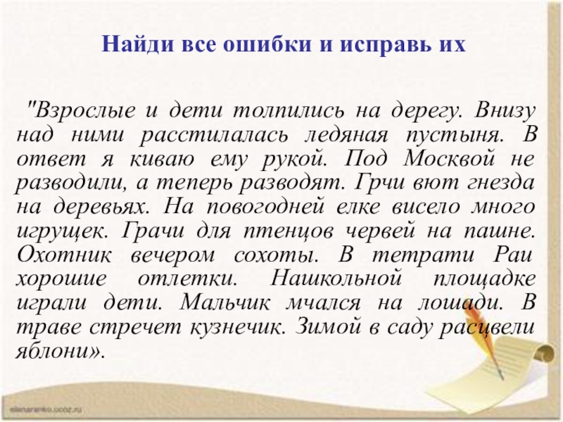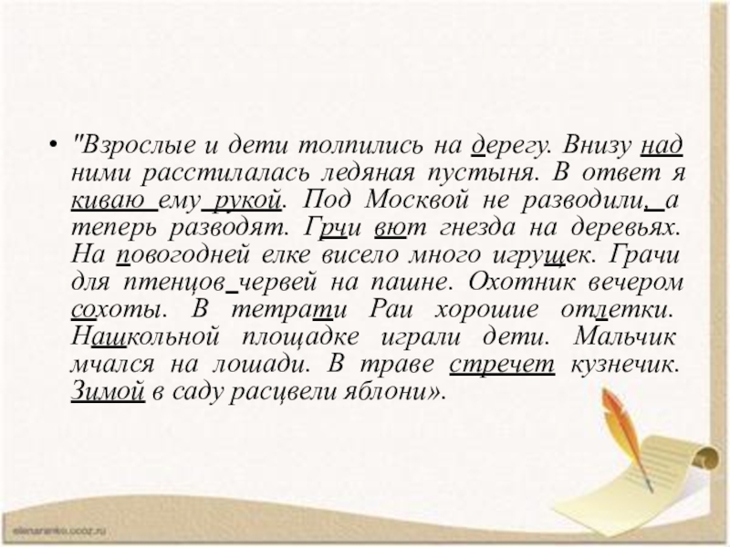 ледяная пустыня. В ответ я киваю ему рукой. Под Москвой не разводили, а теперь разводят. Грчи вют гнезда на деревьях. На повогодней елке висело много игрущек. Грачи для птенцов червей на пашне. Охотник вечером сохоты. В тетрати Раи хорошие отлетки. Нашкольной площадке играли дети. Мальчик мчался на лошади. В траве стречет кузнечик. Зимой в саду расцвели яблони».