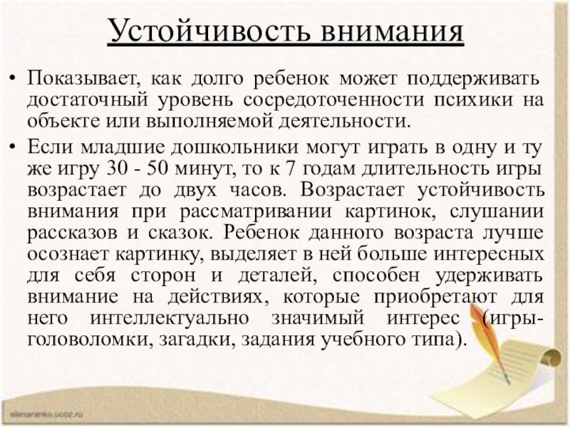 Если младшие дошкольники могут играть в одну и ту же игру 30 - 50 минут, то к 7 годам длительность игры возрастает до двух часов. Возрастает устойчивость внимания при рассматривании картинок, слушании рассказов и сказок. Ребенок данного возраста лучше осознает картинку, выделяет в ней больше интересных для себя сторон и деталей, способен удерживать внимание на действиях, которые приобретают для него интеллектуально значимый интерес (игры-головоломки, загадки, задания учебного типа).