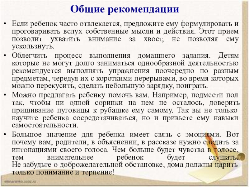 Облегчить процесс выполнения домашнего задания. Детям которые не могут долго заниматься однообразной деятельностью рекомендуется выполнять упражнения поочередно по разным предметам, чередуя их с короткими перерывами, во время которых можно перекусить, сделать небольшую зарядку, поиграть.