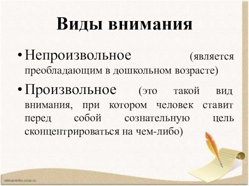 сознательную цель сконцентрироваться на чем-либо. В дошкольном возрасте преобладающим остается непроизвольное внимание, к пяти-шести годам можно наблюдать развитие произвольного и послепроизвольного внимания.