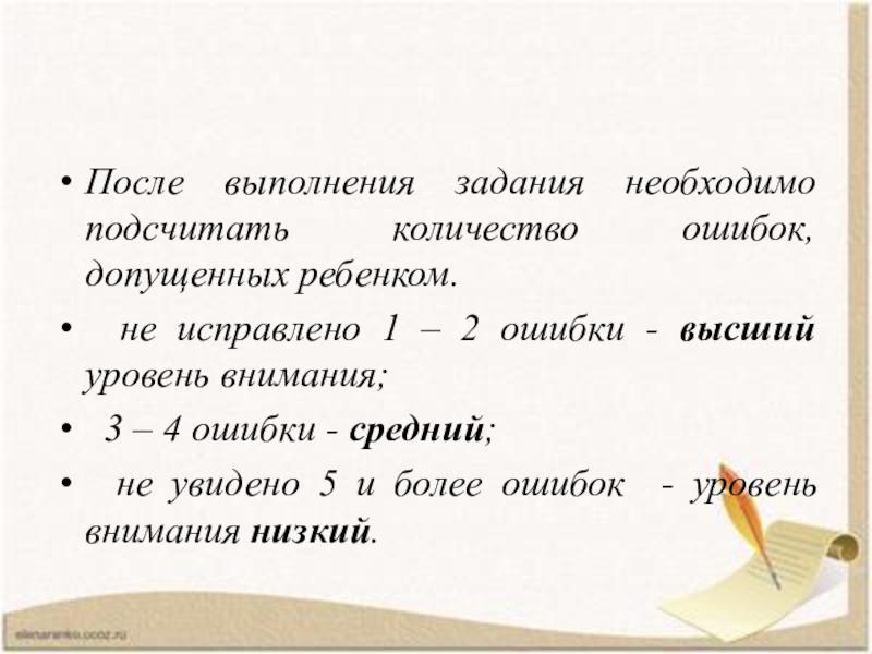 не увидено 5 и более ошибок - уровень внимания низкий.