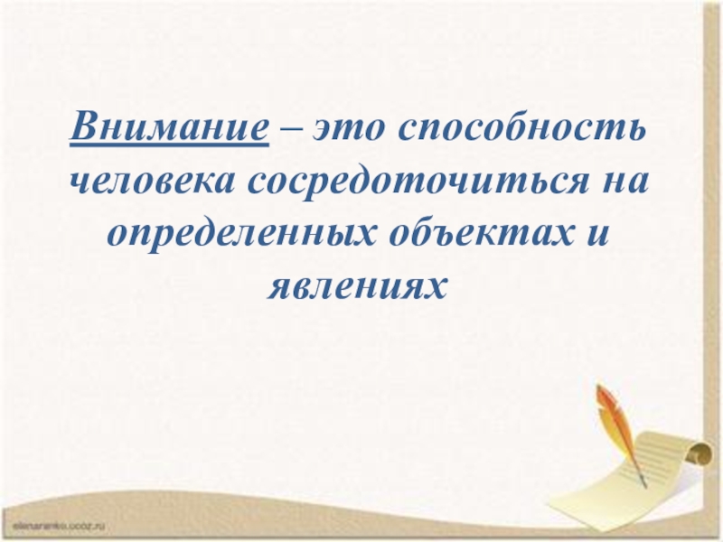 Слайд 2Внимание – это способность человека сосредоточиться на определенных объектах и явлениях