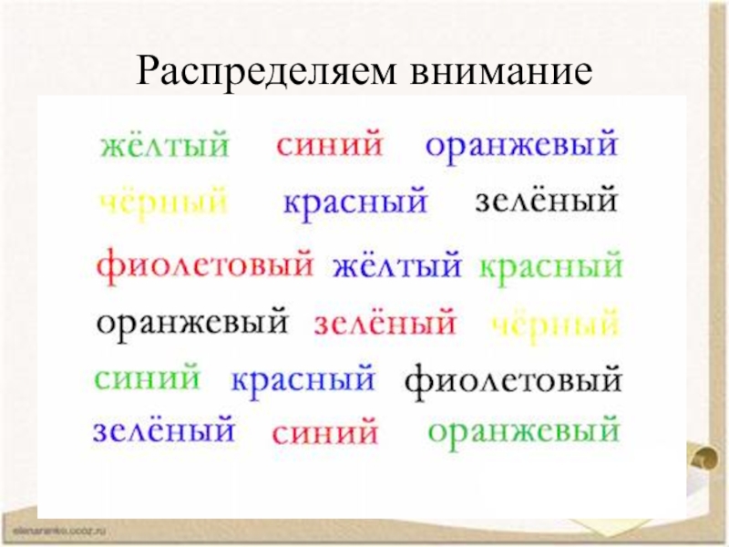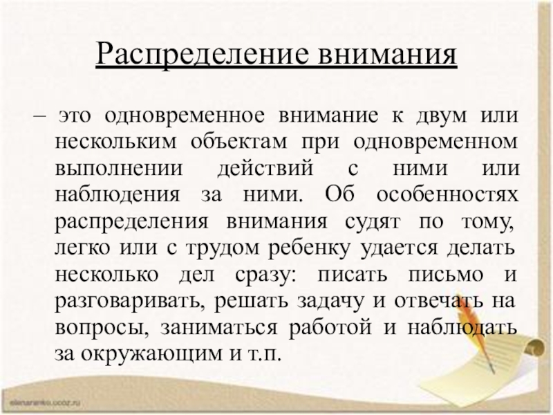 одновременном выполнении действий с ними или наблюдения за ними. Об особенностях распределения внимания судят по тому, легко или с трудом ребенку удается делать несколько дел сразу: писать письмо и разговаривать, решать задачу и отвечать на вопросы, заниматься работой и наблюдать за окружающим и т.п.