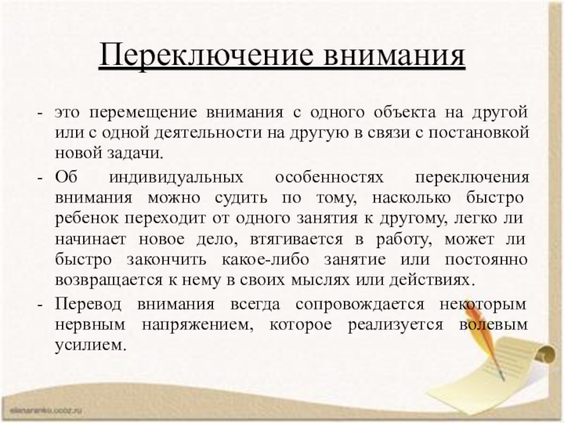 Перевод внимания всегда сопровождается некоторым нервным напряжением, которое реализуется волевым усилием.