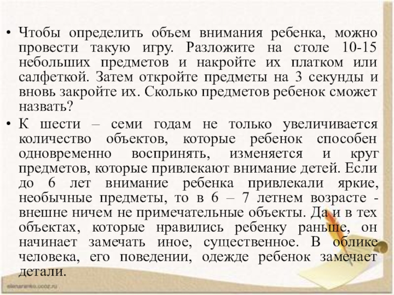 Слайд 10Чтобы определить объем внимания ребенка, можно провести такую игру. Разложите на