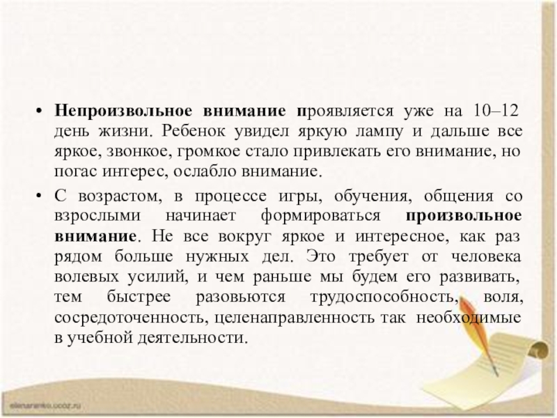 Непроизвольное внимание проявляется уже на 10–12 день жизни. Ребенок увидел яркую