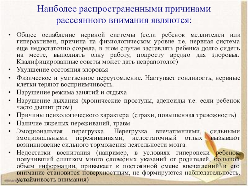 Недостатки воспитания (например, в условиях гиперопеки ребенок, получивший слишком много словесных указаний от родителей, большой объем информации, привыкает к постоянной смене впечатлений и его внимание становится поверхностным, не формируются наблюдательность, устойчивость внимания)