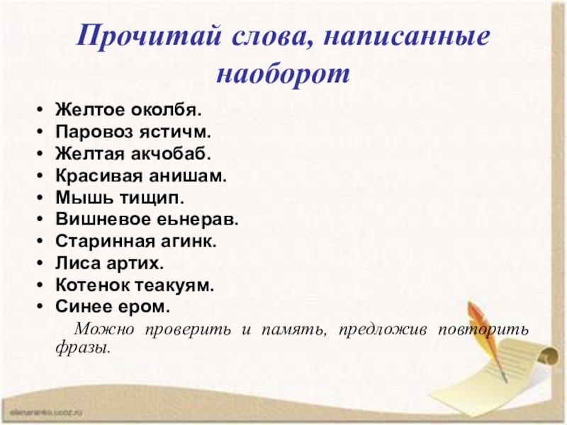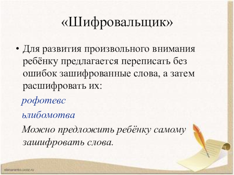 Для развития произвольного внимания ребёнку предлагается переписать без ошибок зашифрованные слова,