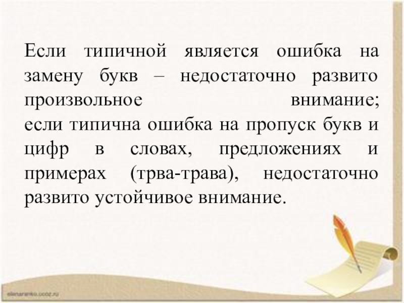 если типична ошибка на пропуск букв и цифр в словах, предложениях и примерах (трва-трава), недостаточно развито устойчивое внимание.