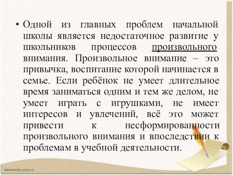 процессов произвольного внимания. Произвольное внимание – это привычка, воспитание которой начинается в семье. Если ребёнок не умеет длительное время заниматься одним и тем же делом, не умеет играть с игрушками, не имеет интересов и увлечений, всё это может привести к несформированности произвольного внимания и впоследствии к проблемам в учебной деятельности.
