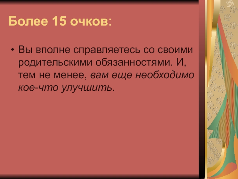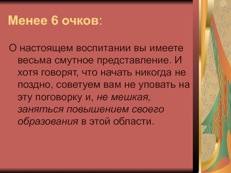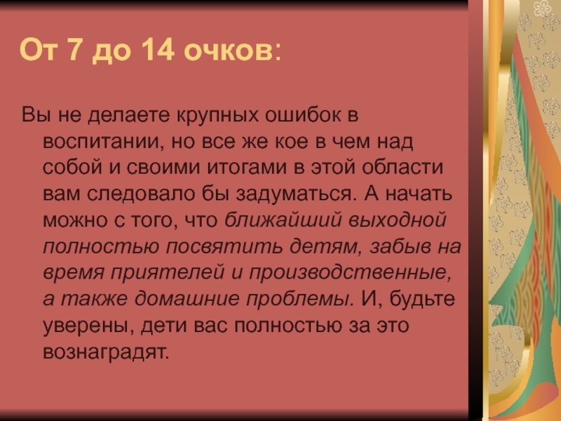 но все же кое в чем над собой и своими итогами в этой области вам следовало бы задуматься. А начать можно с того, что ближайший выходной полностью посвятить детям, забыв на время приятелей и производственные, а также домашние проблемы. И, будьте уверены, дети вас полностью за это вознаградят.