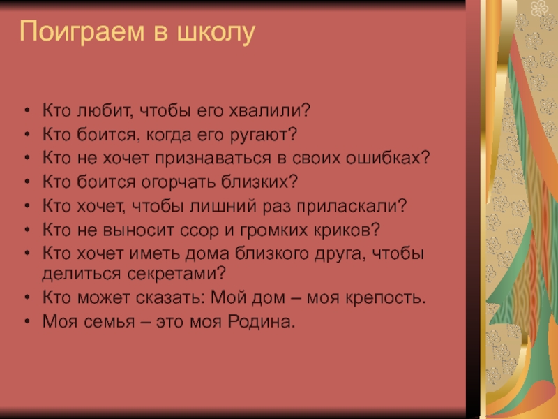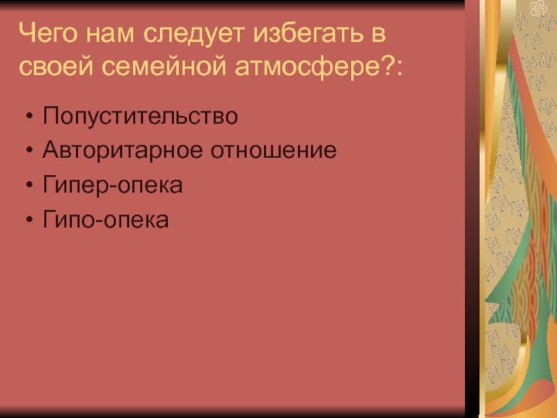 Слайд 10Чего нам следует избегать в своей семейной атмосфере?: