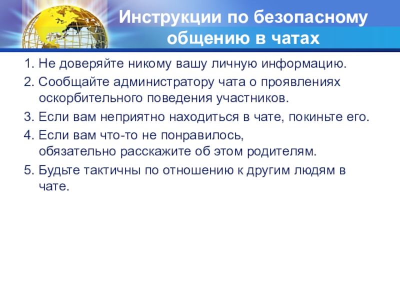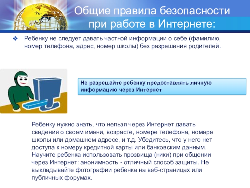 Ребенку нужно знать, что нельзя через Интернет давать сведения о своем имени, возрасте, номере телефона, номере школы или домашнем адресе, и т.д. Убедитесь, что у него нет доступа к номеру кредитной карты или банковским данным. Научите ребенка использовать прозвища (ники) при общении через Интернет: анонимность - отличный способ защиты. Не выкладывайте фотографии ребенка на веб-страницах или публичных форумах.