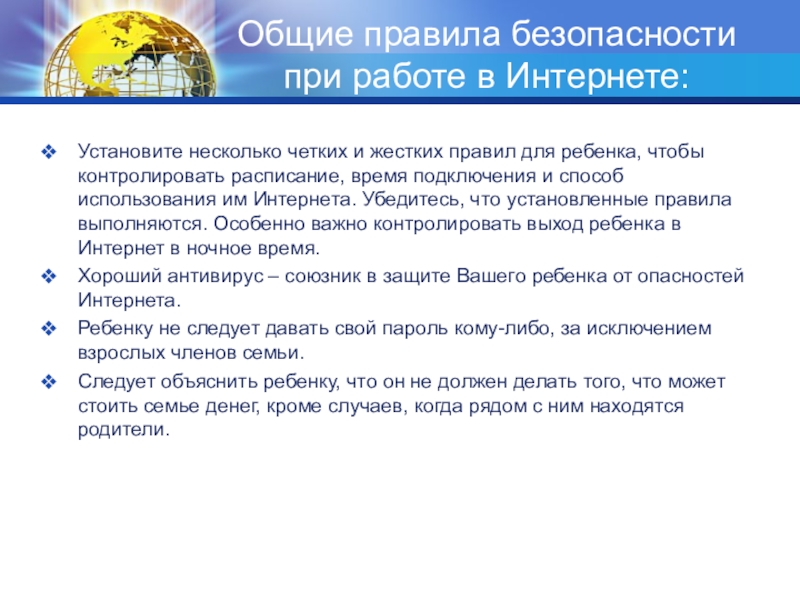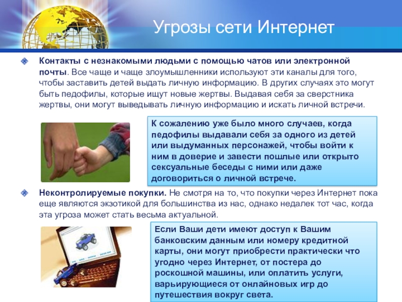 Если Ваши дети имеют доступ к Вашим банковским данным или номеру кредитной карты, они могут приобрести практически что угодно через Интернет, от постера до роскошной машины, или оплатить услуги, варьирующиеся от онлайновых игр до путешествия вокруг света.