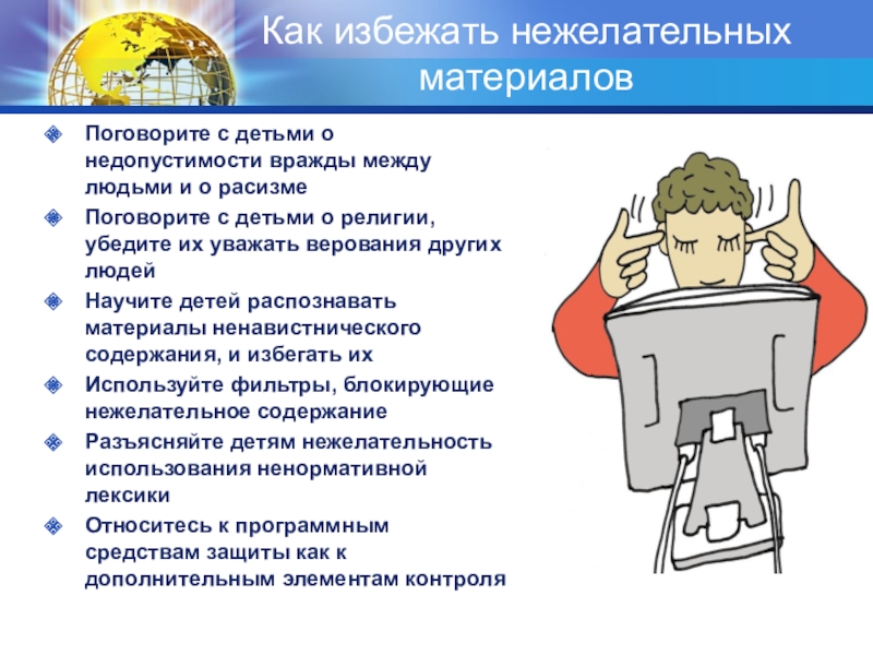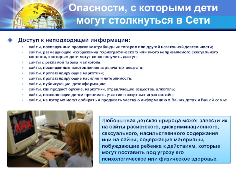 Любопытная детская природа может завести их на сайты расистского, дискриминационного, сексуального, насильственного содержания или на сайты, содержащие материалы, побуждающие ребенка к действиям, которые могут поставить под угрозу его психологическое или физическое здоровье.