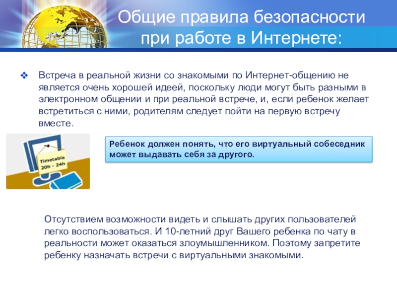 Отсутствием возможности видеть и слышать других пользователей легко воспользоваться. И 10-летний друг Вашего ребенка по чату в реальности может оказаться злоумышленником. Поэтому запретите ребенку назначать встречи с виртуальными знакомыми.