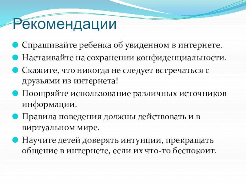 РекомендацииСпрашивайте ребенка об увиденном в интернете.Настаивайте на сохранении конфиденциальности.Скажите, что никогда не следует встречаться с друзьями из