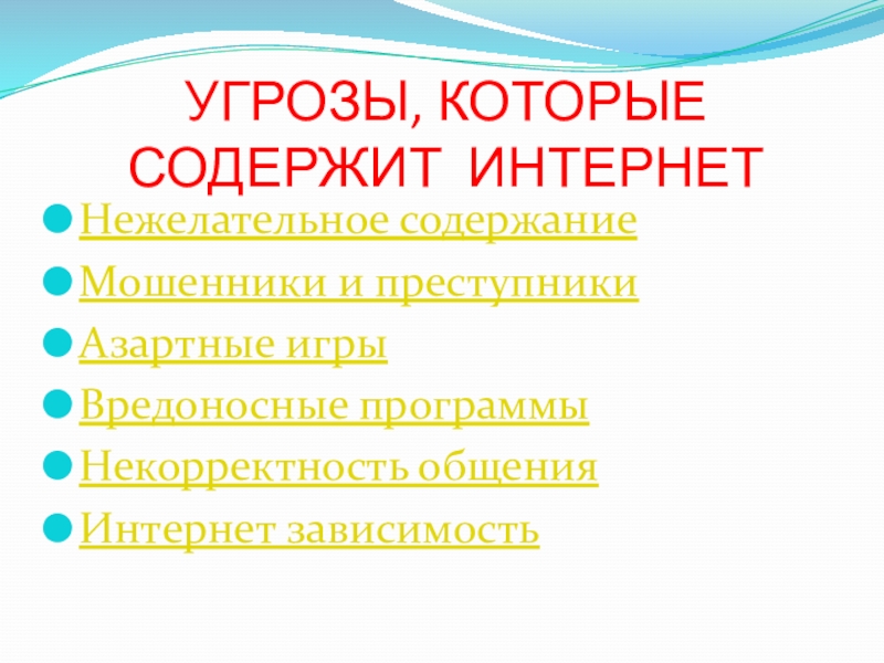 Слайд 4УГРОЗЫ, КОТОРЫЕ СОДЕРЖИТ ИНТЕРНЕТ