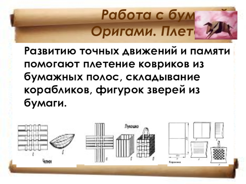 помогают плетение ковриков из бумажных полос, складывание корабликов, фигурок зверей из бумаги.