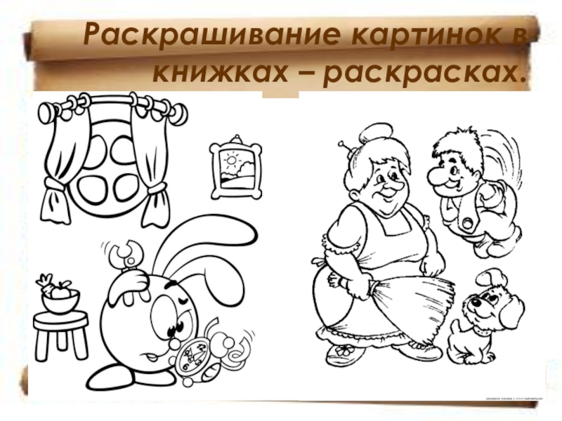 Слайд 30Раскрашивание картинок в книжках – раскрасках.