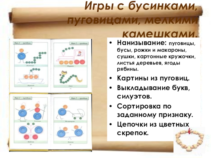 Слайд 25Игры с бусинками,пуговицами, мелкими камешками.