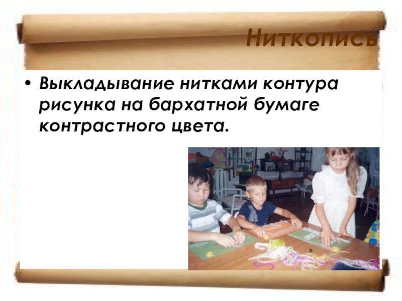 Выкладывание нитками контура рисунка на бархатной бумаге контрастного цвета.