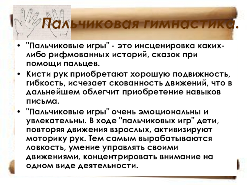 "Пальчиковые игры" очень эмоциональны и увлекательны. В ходе "пальчиковых игр" дети, повторяя движения взрослых, активизируют моторику рук. Тем самым вырабатываются ловкость, умение управлять своими движениями, концентрировать внимание на одном виде деятельности.