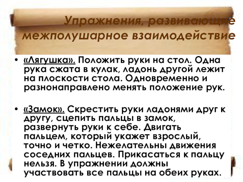 Слайд 23Упражнения, развивающие межполушарное взаимодействие