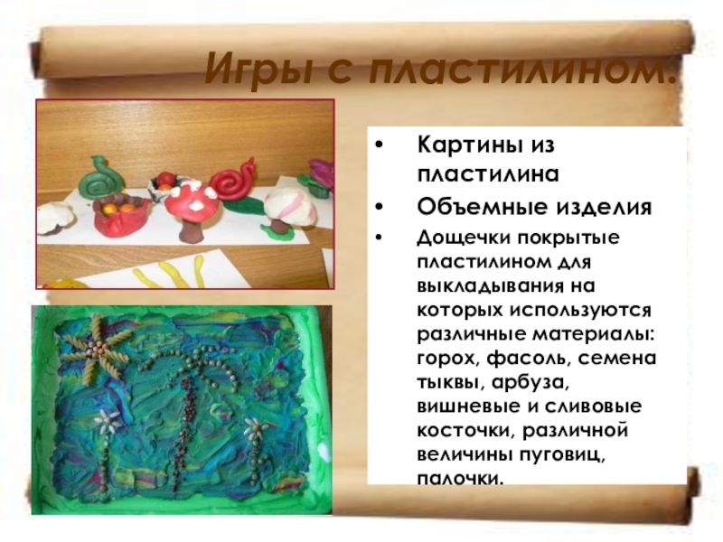 на которых используются различные материалы: горох, фасоль, семена тыквы, арбуза, вишневые и сливовые косточки, различной величины пуговиц, палочки.