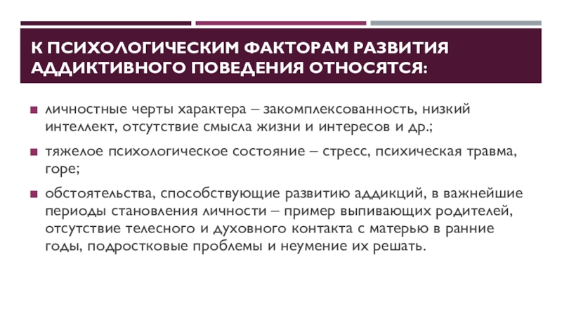 Слайд 16К психологическим факторам развития аддиктивного поведения относятся: