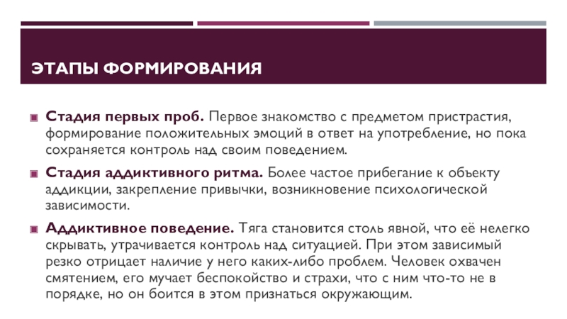 Стадия первых проб. Первое знакомство с предметом пристрастия, формирование положительных