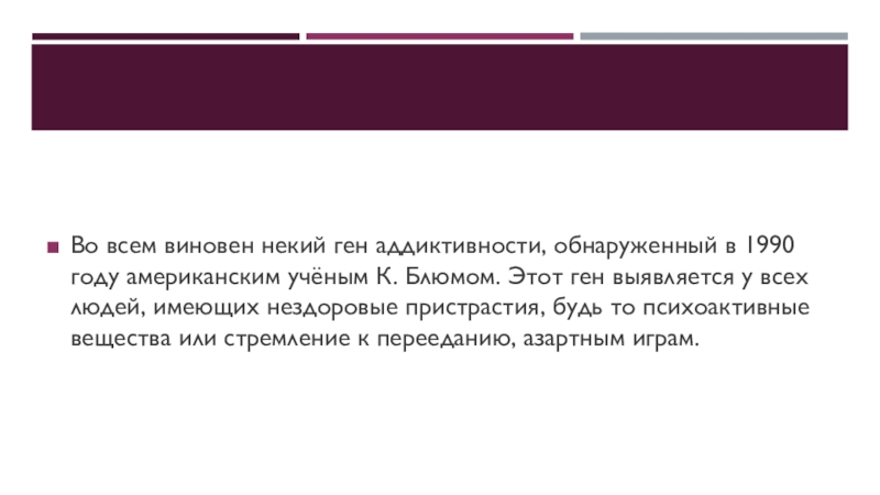 Слайд 6Во всем виновен некий ген аддиктивности, обнаруженный в 1990 году американским