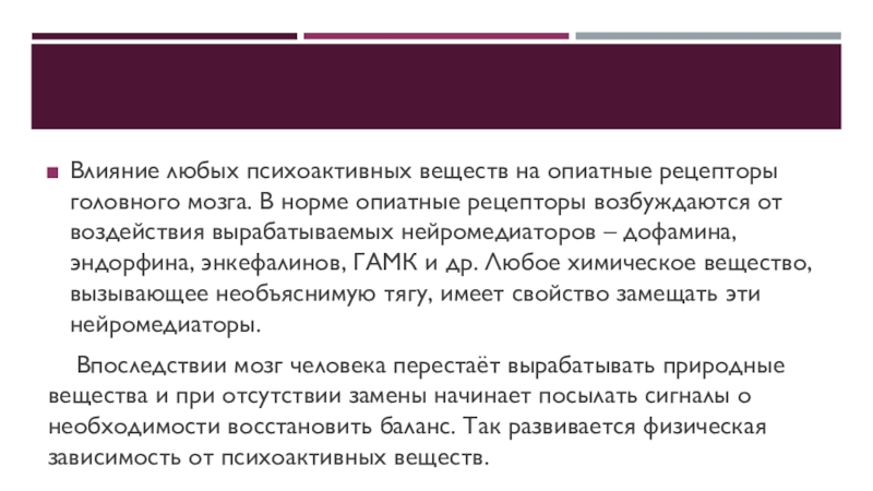 опиатные рецепторы возбуждаются от воздействия вырабатываемых нейромедиаторов – дофамина, эндорфина, энкефалинов, ГАМК и др. Любое химическое вещество, вызывающее необъяснимую тягу, имеет свойство замещать эти нейромедиаторы.