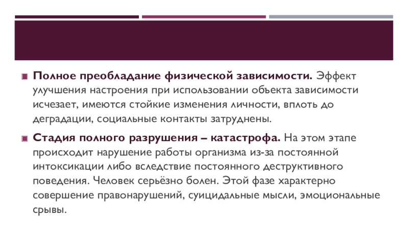 Слайд 20Полное преобладание физической зависимости. Эффект улучшения настроения при использовании объекта зависимости