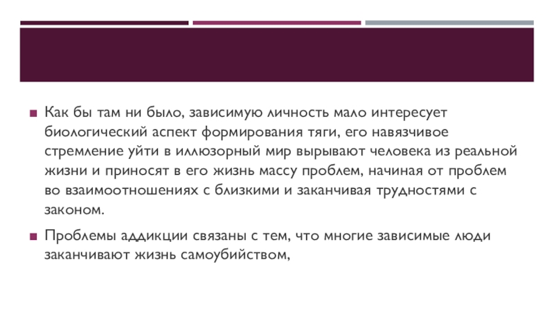 Слайд 9Как бы там ни было, зависимую личность мало интересует биологический аспект