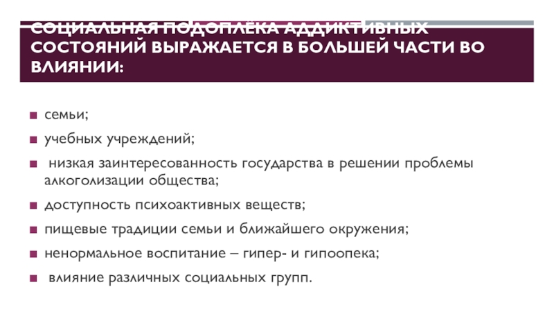 Слайд 17Социальная подоплёка аддиктивных состояний выражается в большей части во влиянии: