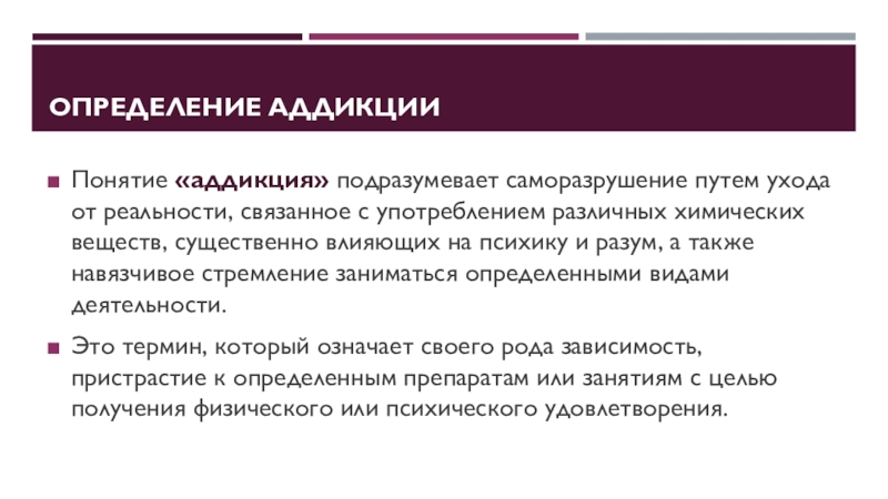 Понятие «аддикция» подразумевает саморазрушение путем ухода от реальности, связанное с